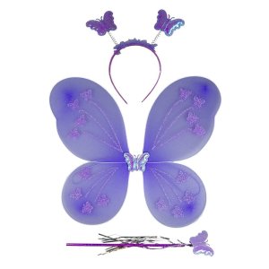 Zestaw motylka, wróżki. Komplet zawiera opaskę z motylkami na sprężynkach, różdżkę oraz skrzydełka. Skrzydełka zostały wyposażone w gumki umożliwiające komfortowe noszenie. Strój lub uzupełnienie kostiumu dziecięcego na bal przebierańców, zabawę tematyczną, przedstawienie.