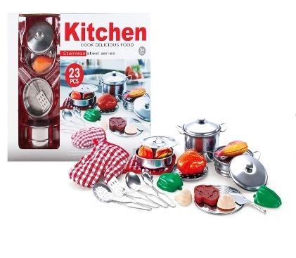 W zestawie:- garnek- patelnia- wkładka do gotowania na parze- 3 pokrywki- łopatka- chochla- cedzak- łyżka do makronu- talerzyk- 2 sitka- rękawica kuchenna- ścierka- 6 warzyw do krojenia- tasak- stek Pozostałe informacje:- wym. opak.